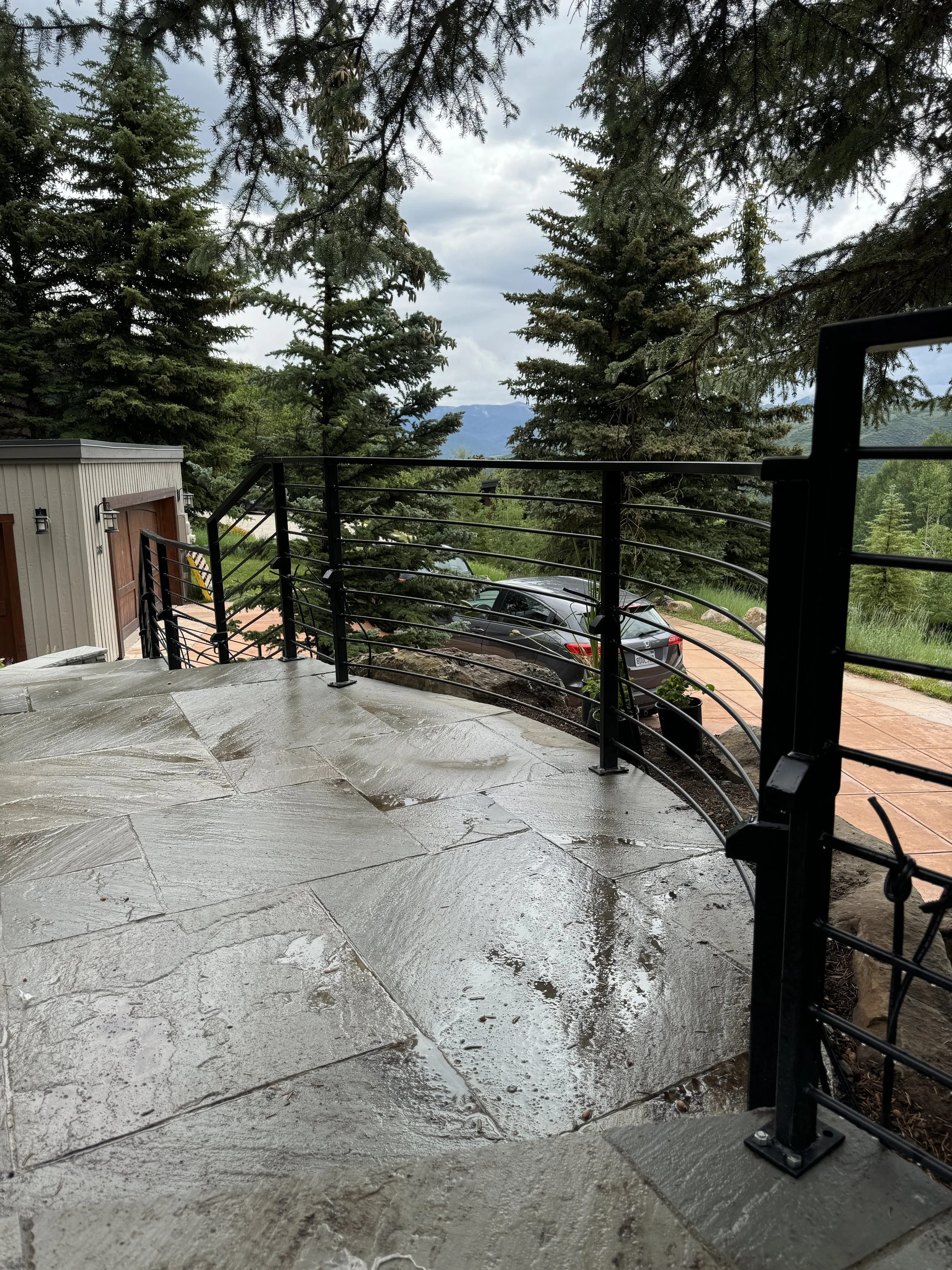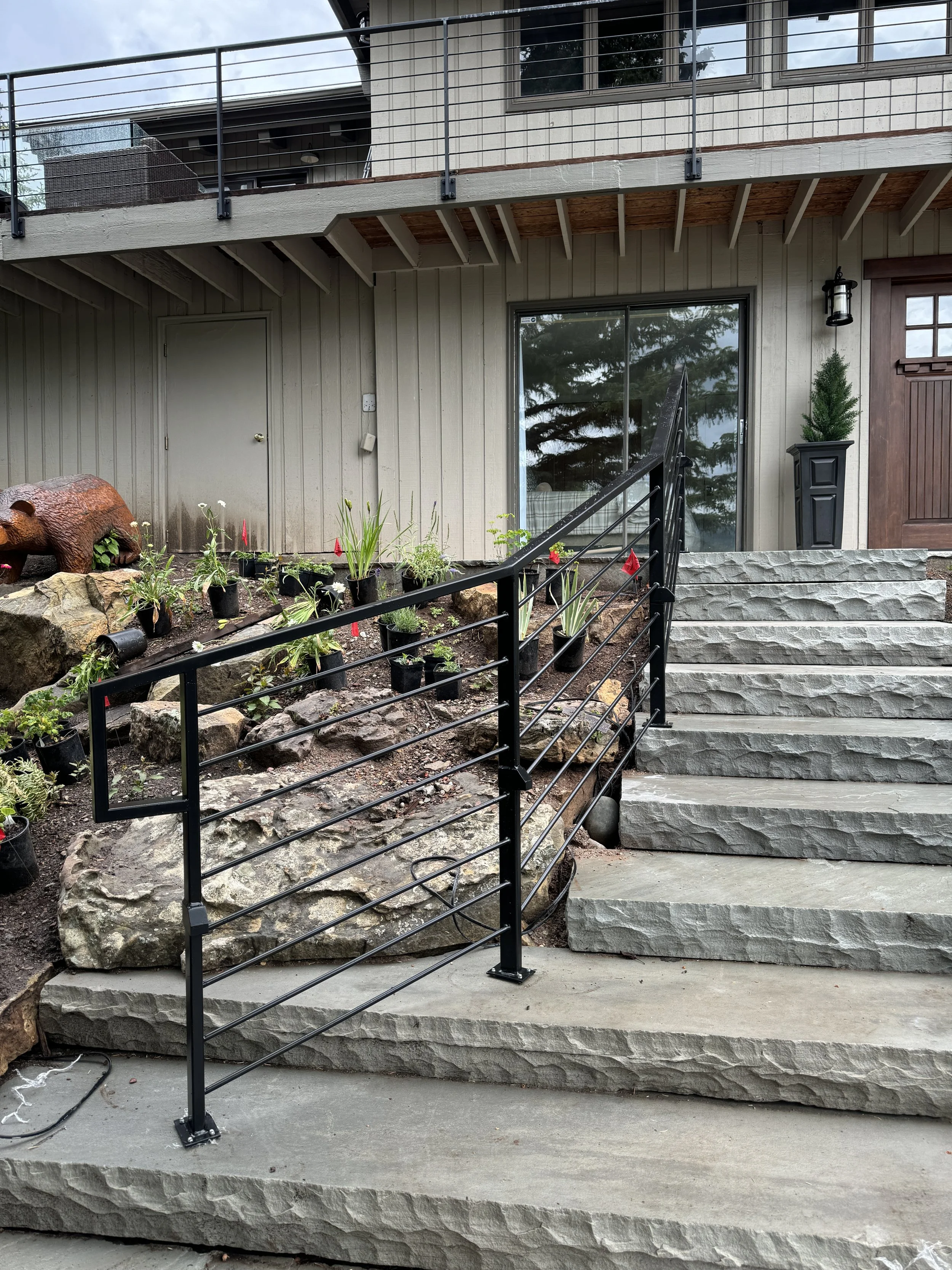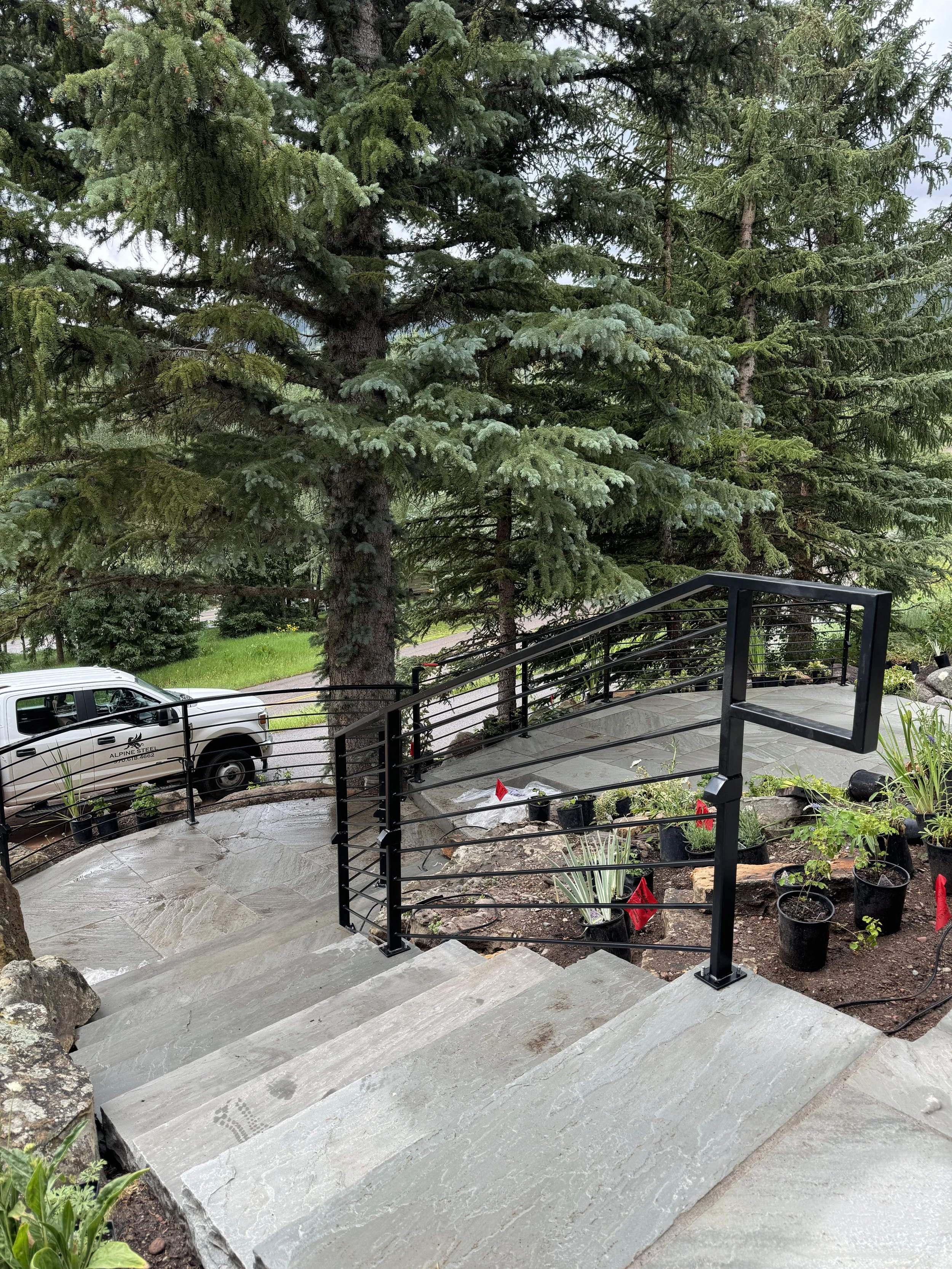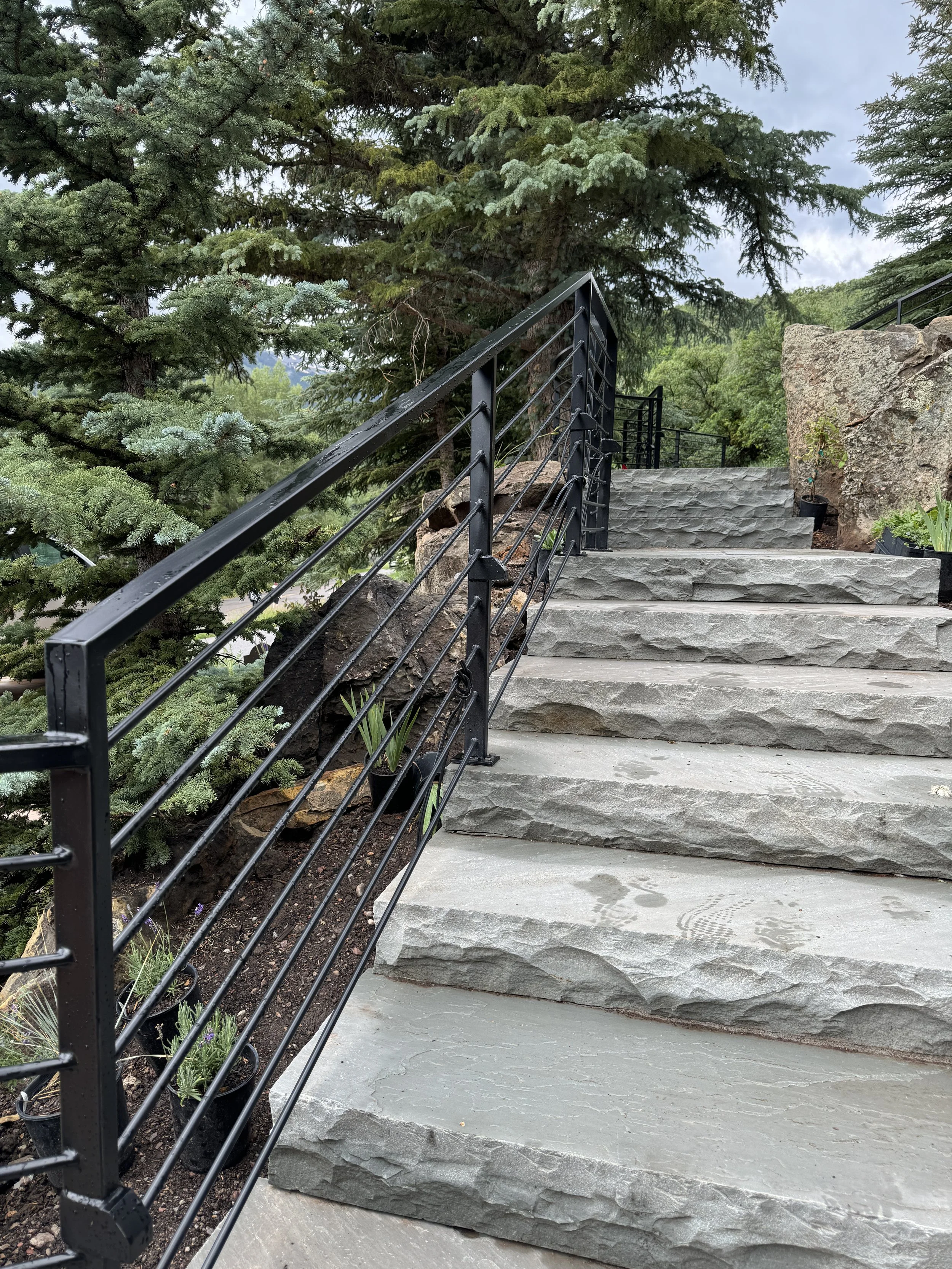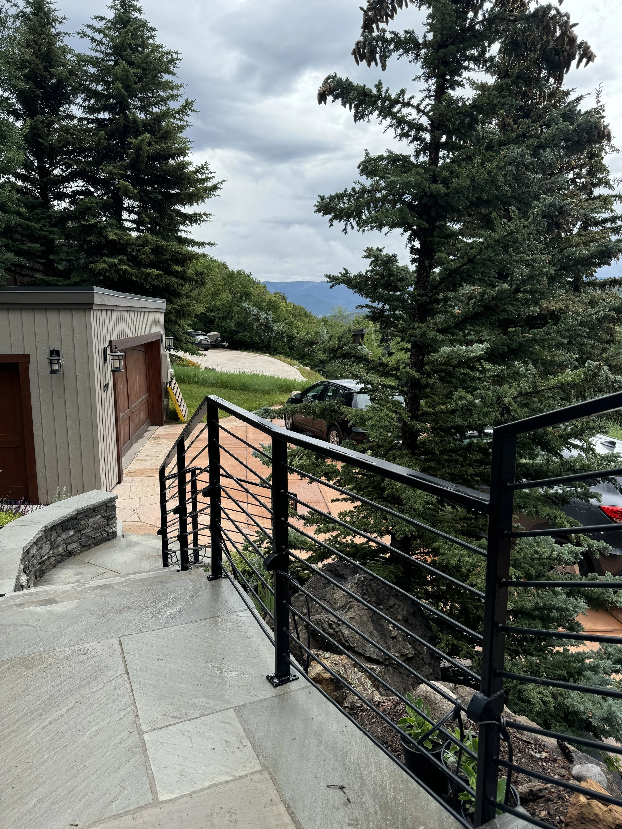 Sleek steel railings seamlessly integrated with natural stone steps, creating a clean and modern approach that complements the mountain setting. Designed for durability and style, these custom-built railings enhance safety without disrupting the surrounding landscape.